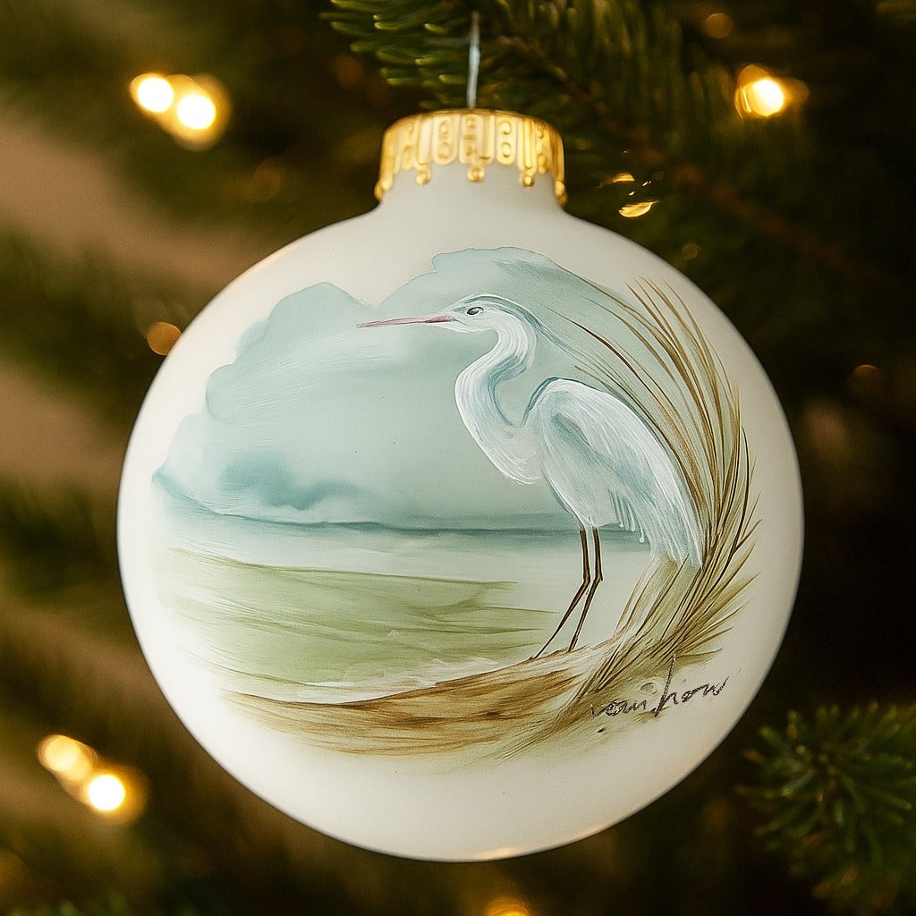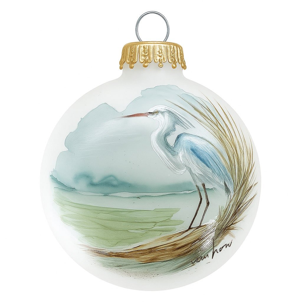 Bring the tranquil beauty of the coast to your holiday tree with this stunning Great Blue Heron ornament, hand-painted by artist Debra Van Horn. Each ornament is an original acrylic painting on a 3¼” frosted glass globe, showcasing the graceful heron standing quietly among coastal reeds and calm waters.