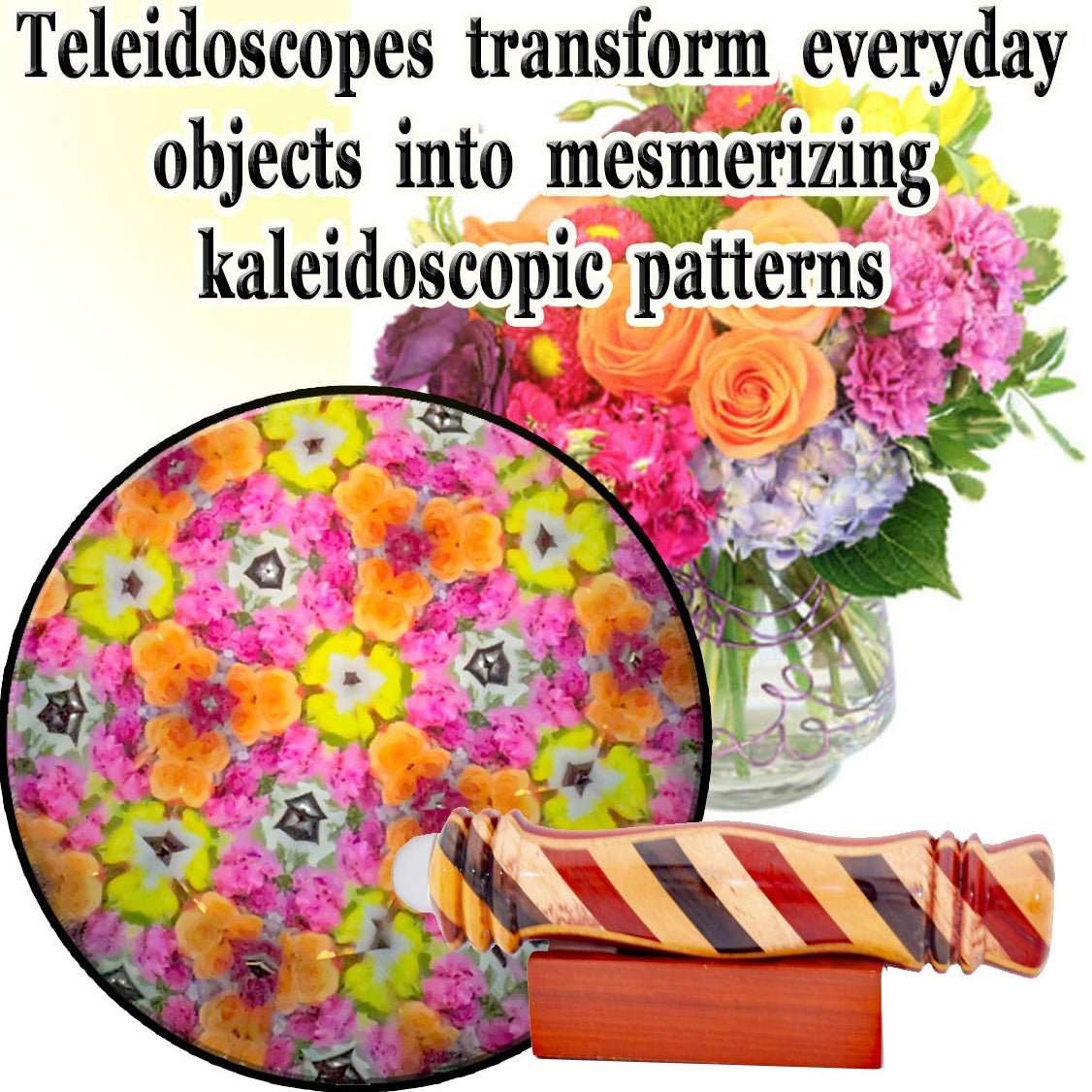 Introducing the 4.5-inch Teleidoscope Padauk Wide Striped a captivating optical marvel crafted from solid Padauk wood, seamlessly blending art and inspiration. Unlike traditional kaleidoscopes, this compact masterpiece features a clear lens that transforms anything it faces into mesmerizing kaleidoscopic imagery. The magic lies in discovering artistic value in your surroundings. This remarkable teleidoscope includes a solid wooden base for stability and comes in a beautiful blue gift box for enhanced gifting appeal. Measuring 4-1/2" x 3/4'', it's a portable masterpiece proudly made in the USA, offering endless patterns, colors, and artistic possibilities—elevating your perspective to discover the magic within your own surroundings.
