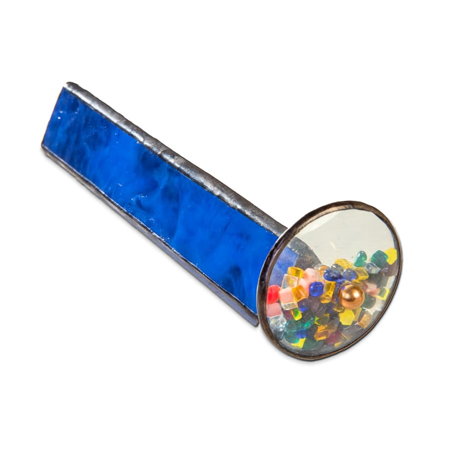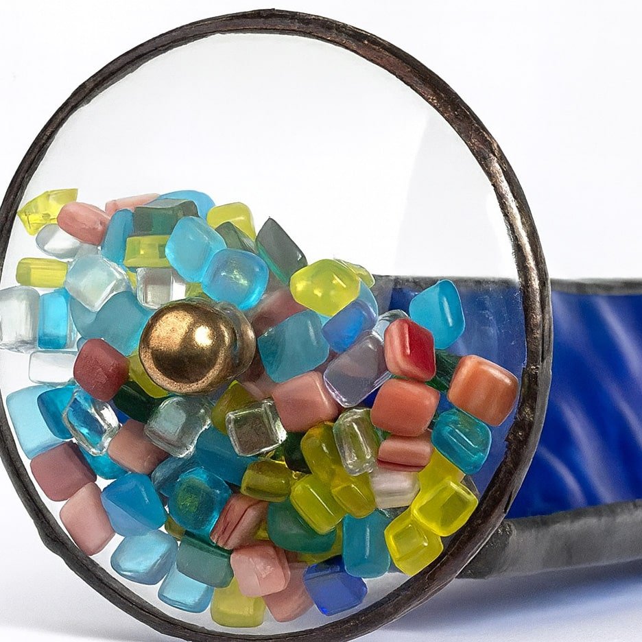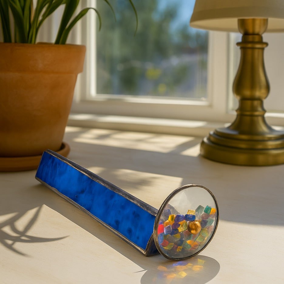 Discover stunning nostalgia with our Blue Glass Kaleidoscope – Tumble Wheel, a handcrafted piece of stained glass artistry designed to capture the imagination. Made from rich cobalt blue opalescent glass, each kaleidoscope features a single tumble wheel filled with vibrant, tumbling glass chips that create ever-changing, colorful images with every gentle turn. No two are ever alike—each kaleidoscope is a one-of-a-kind treasure.