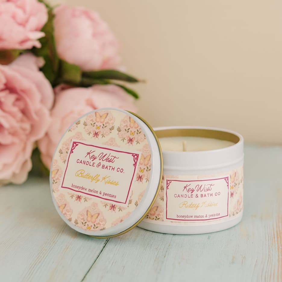 Embrace the soft, sweet beauty of Butterfly Kisses, a delicate blend of fresh honeydew melon and blooming peonies. This hand-poured candle captures the feeling of a gentle summer breeze fluttering through a garden in full bloom.