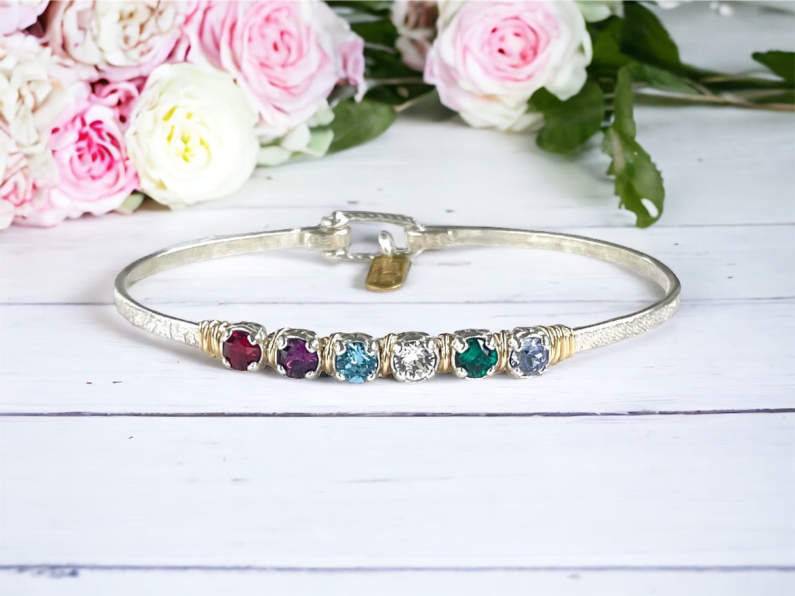 Let us make you a custom birthstone bracelet with all the ones you love represented on one band! Each one is custom-made in our studio just for you! Base price includes up to 3 settings, add additional settings (Up to 12 total) for $16 each. Great for Mothers and Grandmothers!
