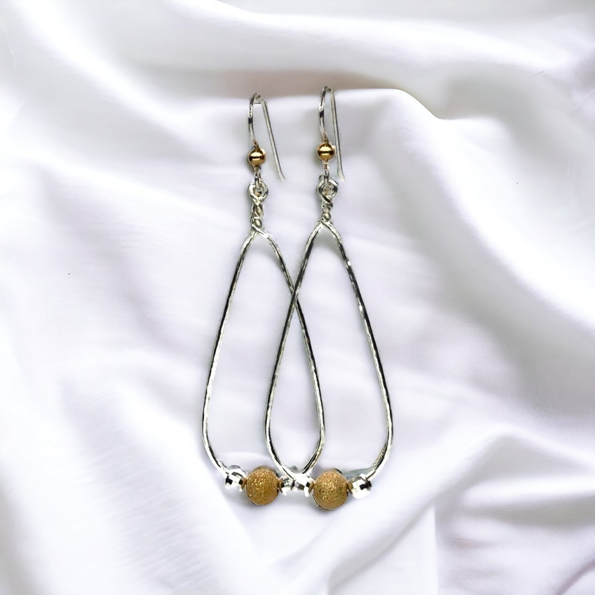 Made in our studio with Sterling Silver wire. These lightweight beauties feature two Silver beads and a Gold Filled Stardust bead for outstanding sparkle! Made in USA.