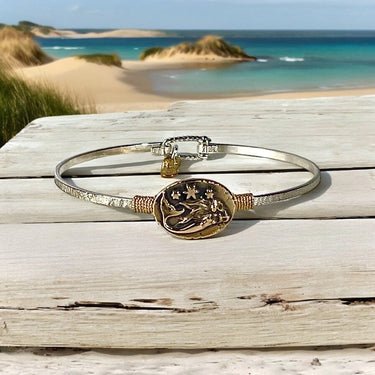 Choose a sterling silver or 14K gold-filled band, accented with a 14K gold-filled wire wrap, and finished with a sterling silver or ancient bronze medallion. Crafted in the USA using environmentally friendly, recycled silver and gold, this bracelet blends coastal symbolism with artisan craftsmanship.