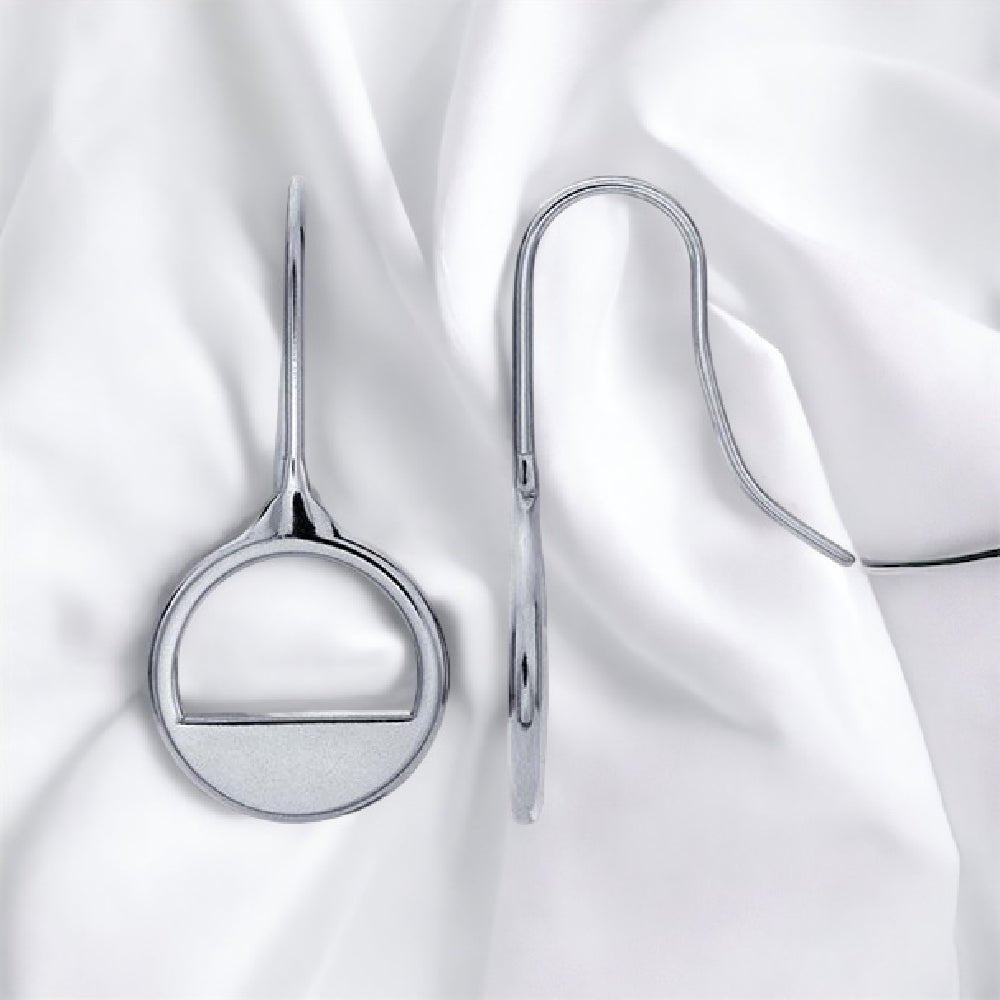 These sterling silver earrings feature a circle shape; half the circle is open while the other is solid. These are not made in our studio. Made in USA.