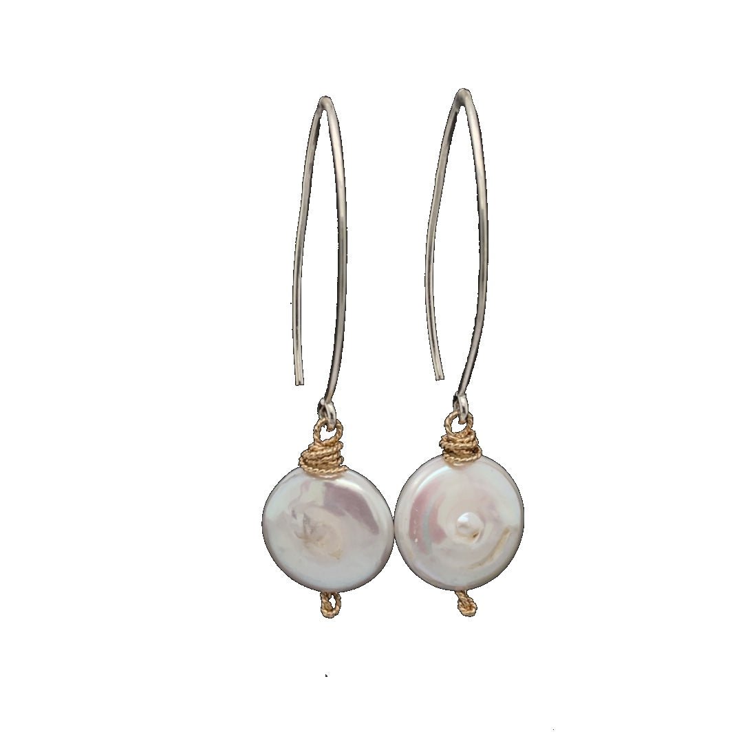 The Luna Pearl earrings are handmade in our studio. These beautiful earrings have the soft glow of a big full moon! The flowing lines of the Sterling Silver ear wires beautifully accentuate the natural freshwater round pearl. Pearls are approximately 15mm diameter. Made in USA.