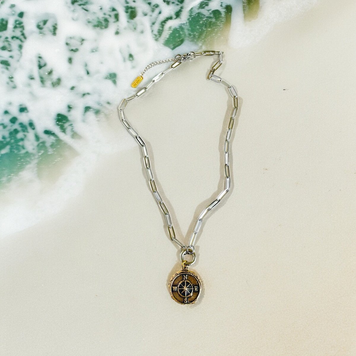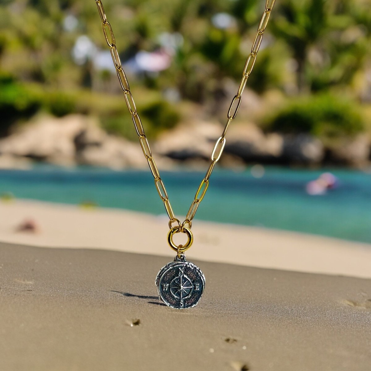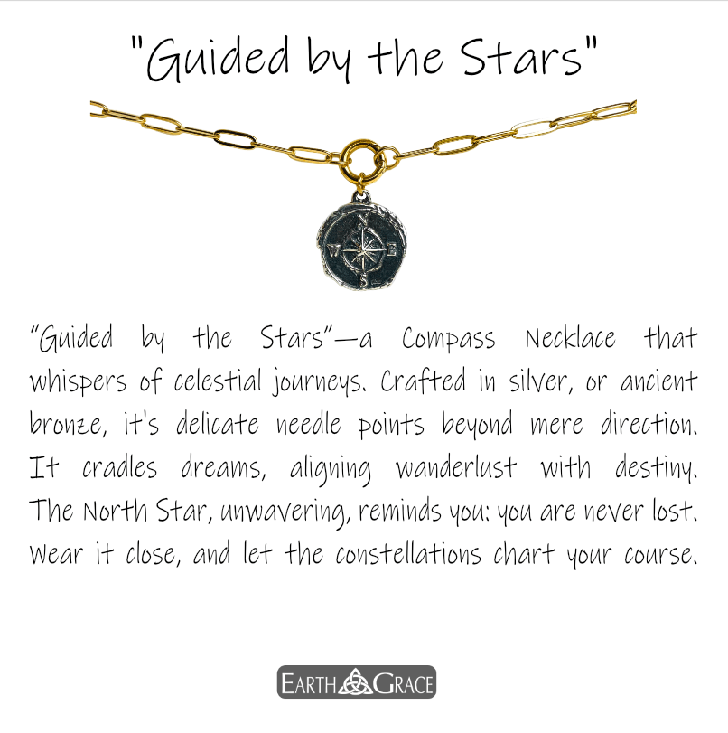 “Guided by the Stars”—a Compass Necklace that whispers of celestial journeys. Crafted in silver, or ancient bronze, its delicate needle points beyond mere direction. It cradles dreams, aligning wanderlust with destiny. The North Star, unwavering, reminds you: you are never lost. Wear it close, and let the constellations chart your course. Back is engraved with "Guided by the Stars".