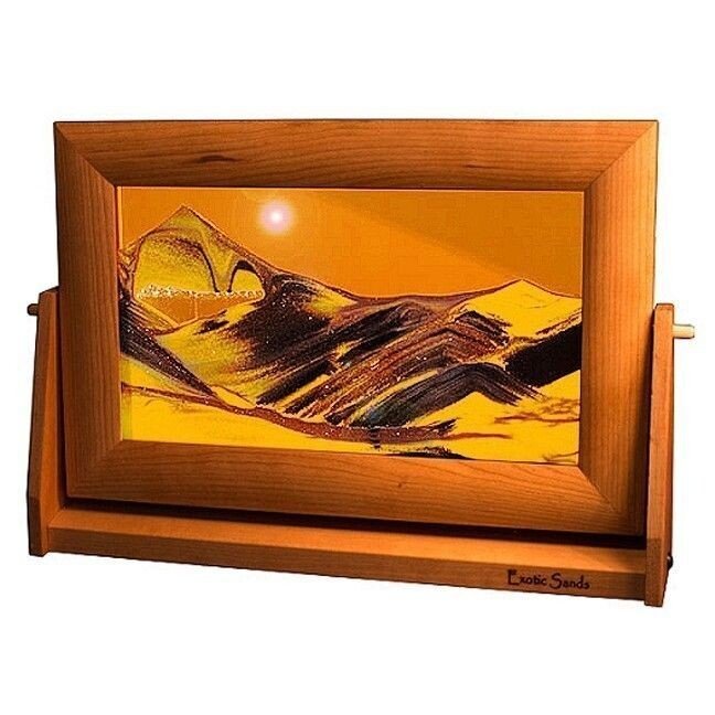 Experience the captivating beauty of Large Sunset Orange Moving Sand Pictures, where art and motion combine in a mesmerizing display. This one-of-a-kind masterpiece contains a Sunset Orange liquid, a harmonious blend of black, coral pink, and four types of white sand, and a delicate touch of fine copper glitter. Double-strength glass and quality cherry wood frame this finely handcrafted, double-sided rotating frame with a unique half-rounded profile. As it turns, air bubbles suspend the sands, crafting ever-changing landscapes that may take minutes or hours to complete. The difference in weight between the sands keeps them separate, adding depth and dimension to the artwork. This 9" x 12" piece brings tranquility and wonder to your space.