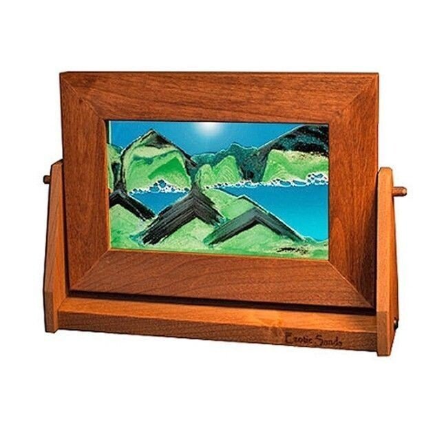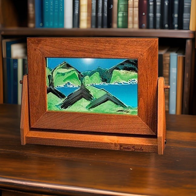 This Small Moving Sand Picture in Summer Turquoise mesmerizes the eye with its 7" x 9" double-strength glass frame and finely handcrafted double-sided rotating frame. Crafted in the USA, it features a unique half-rounded profile that showcases the art beautifully. Inside, a Summer Turquoise liquid cradles black sand, four variations of pristine white sand, and a hint of green glitter. As it turns, air bubbles suspend the sands, revealing distinct scenes. The differing weights of the black and white sand create a dynamic visual display, while the mix of transparent and opaque provides depth and dimension. Inviting moments of contemplation, this piece offers a soothing and relaxing experience.