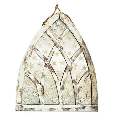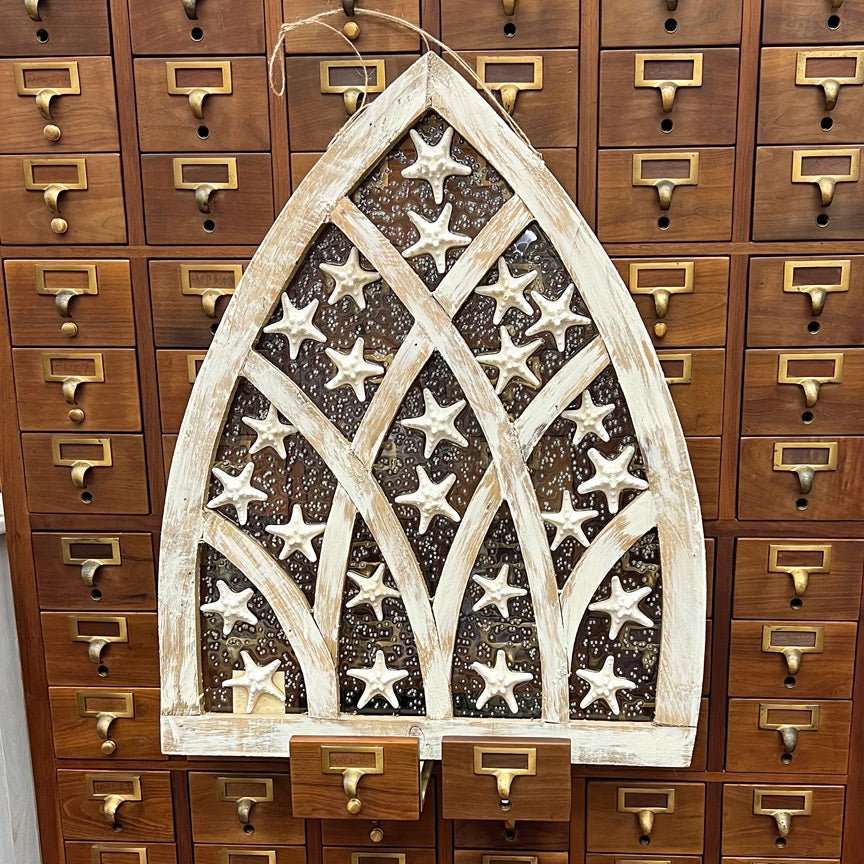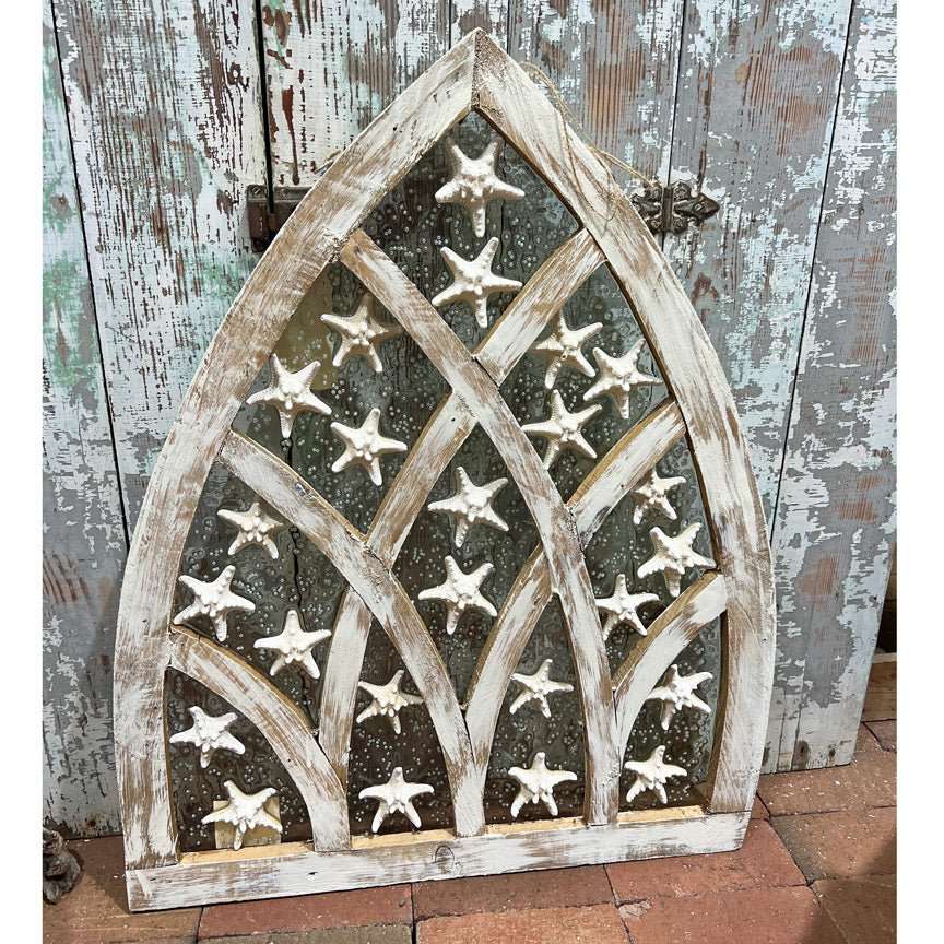 Create an enchanting coastal atmosphere in your home with our handcrafted Starfish Cathedral Resin Window Art. Located on the Outer Banks of North Carolina, USA, this one-of-a-kind piece showcases genuine starfish encased in a reclaimed, whitewashed wooden frame with a cathedral-style design. With meticulous attention to detail, each artwork is uniquely crafted for a truly one-of-a-kind piece.