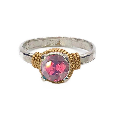 Handmade in our studio, this simple ring is a charmer! Hammered band with beaded 14K Gold Filled wire wrap, hand set European Crystal. Made in USA.