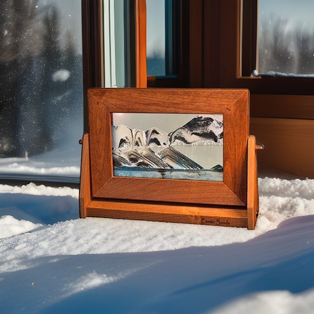 Witness the serene beauty of the Art In Motion: Moving Sand Pictures Arctic Glacier Clear. Within the double-strength frame, you'll find a unique combination of liquid, black sand, four white sands, and a hint of blue glitter. Crafted from quality knotty alder wood, this handcrafted double-sided frame has distinctive half-rounded edges for versatile display. Air bubbles within the frame create a shifting landscape, with sand making distinct scenes in minutes or hours. The black sand is heavier, creating a 3-D effect that adds depth and texture. At 7" x 9", this art piece is a beautiful reminder of nature's changing beauty with each turn.