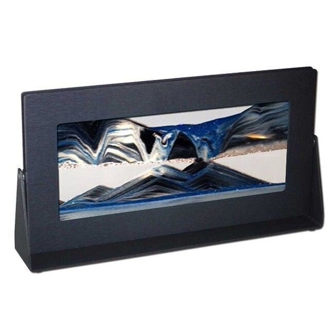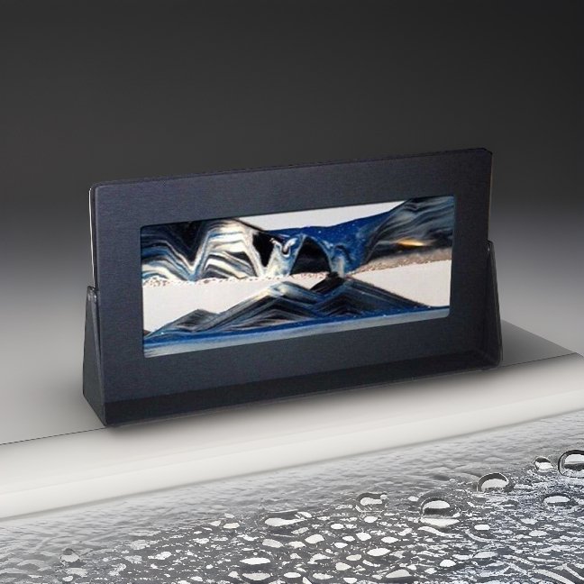 Experience the captivating beauty of the 7"x 12" Arctic Glacier Clear Moving Sand Picture. This unique art piece features a double-strength glass holding black sand, four white sands, and blue glitter. The frame is crafted with Black Anodized Metal for a contemporary look. When rotated, delicate air bubbles suspend the sands to create one-of-a-kind scenes in minutes or over hours. The varying weights of the black and white sands keep them separate while providing depth and dimension. The Exotic Sands relaxation and BEST QUALITY make this USA-made artwork a remarkable addition to your home, offering moments of contemplation and relaxation with each graceful turn.