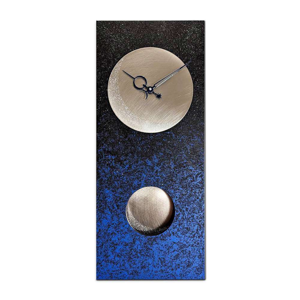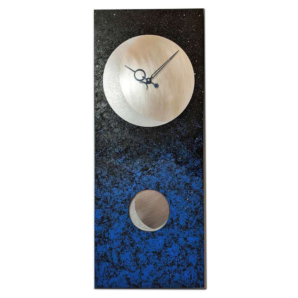 - **Materials: Brushed stainless steel face and pendulum, hand-painted wooden background with a black-to-blue fade