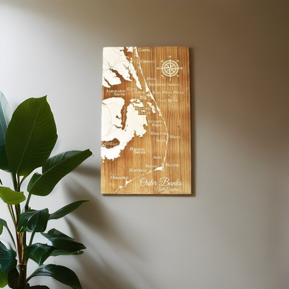 Available in three stunning finishes—Sea Glass, Behr Papier, and Island Oasis—our handcrafted wooden map of the Outer Banks, North Carolina, is a perfect fit for any décor.