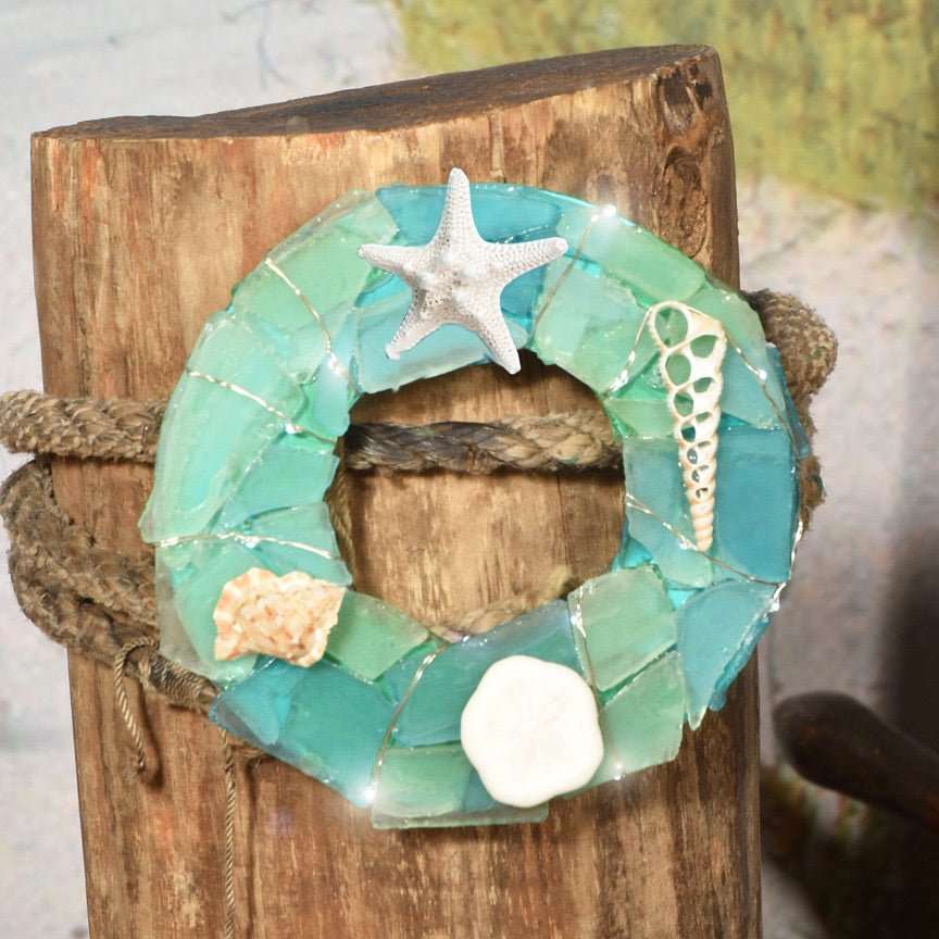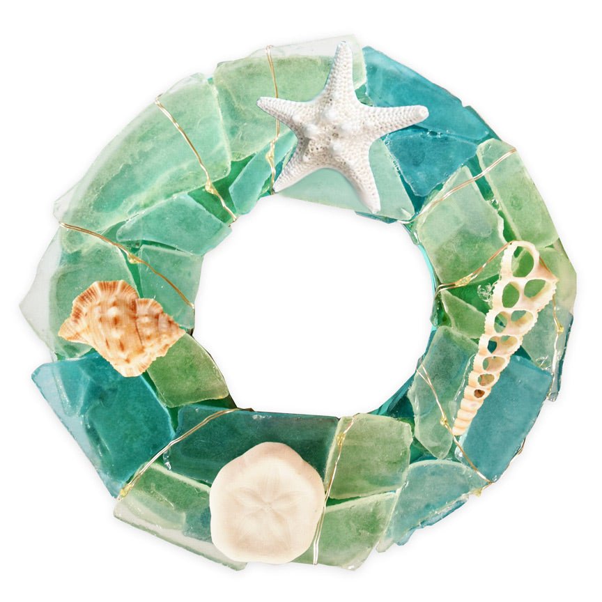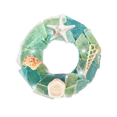Sea Glass Lighted Wreath by Marji Knecht;Bring the magic of the sea into your home with Marji Knecht's stunning Seaglass Lighted Wreaths! Handcrafted with meticulous care, these coastal masterpieces feature real starfish, seashells, and seaglass-styled glass in enchanting hues of teal, seafoam, and white. Accentuated by battery-operated fairy lights, each wreath casts a warm, magical glow that captures the serene beauty of the ocean. Perfect for any space, these wreaths add a touch of seaside elegance to your holiday decor or year-round coastal accents.