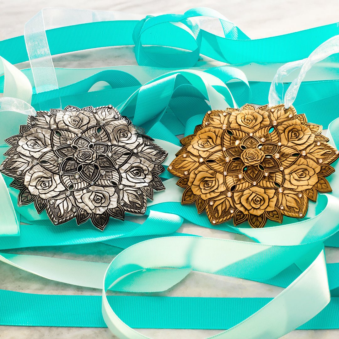 The Rose Snow Crystal Ornament in Bronze is a stunning addition to our series of handcrafted ornaments adorned with exquisite Austrian Crystals. The rose, symbolizing love, beauty, and grace, is elegantly captured in this delicate piece, making it a perfect keepsake that will look beautiful on your tree, or displayed all year-round.