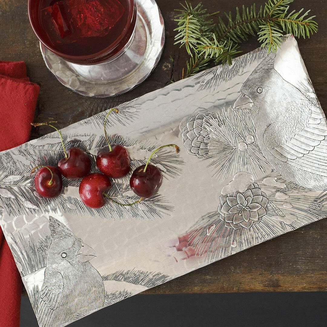 The Winter Cardinal Small Horizons Server is delightful in its hand-wrought intricacy, the product of master die cutter Ken Youngo. At Wendell August Forge, we craft true works of art using metalworking methods rooted in centuries-old techniques. The cardinal is a timelessly appealing bird - testimony to this is the fact that it is the state bird of seven different U.S. states. It's easy to see why, with the striking, cheery red color of the male, which can be spotted year-round in the species' home territory. Bring this inspiringly beautiful piece into your home to use for entertaining, or simply to enjoy the craftsmanship and metalworking tradition reflected in its charm and sophistication.