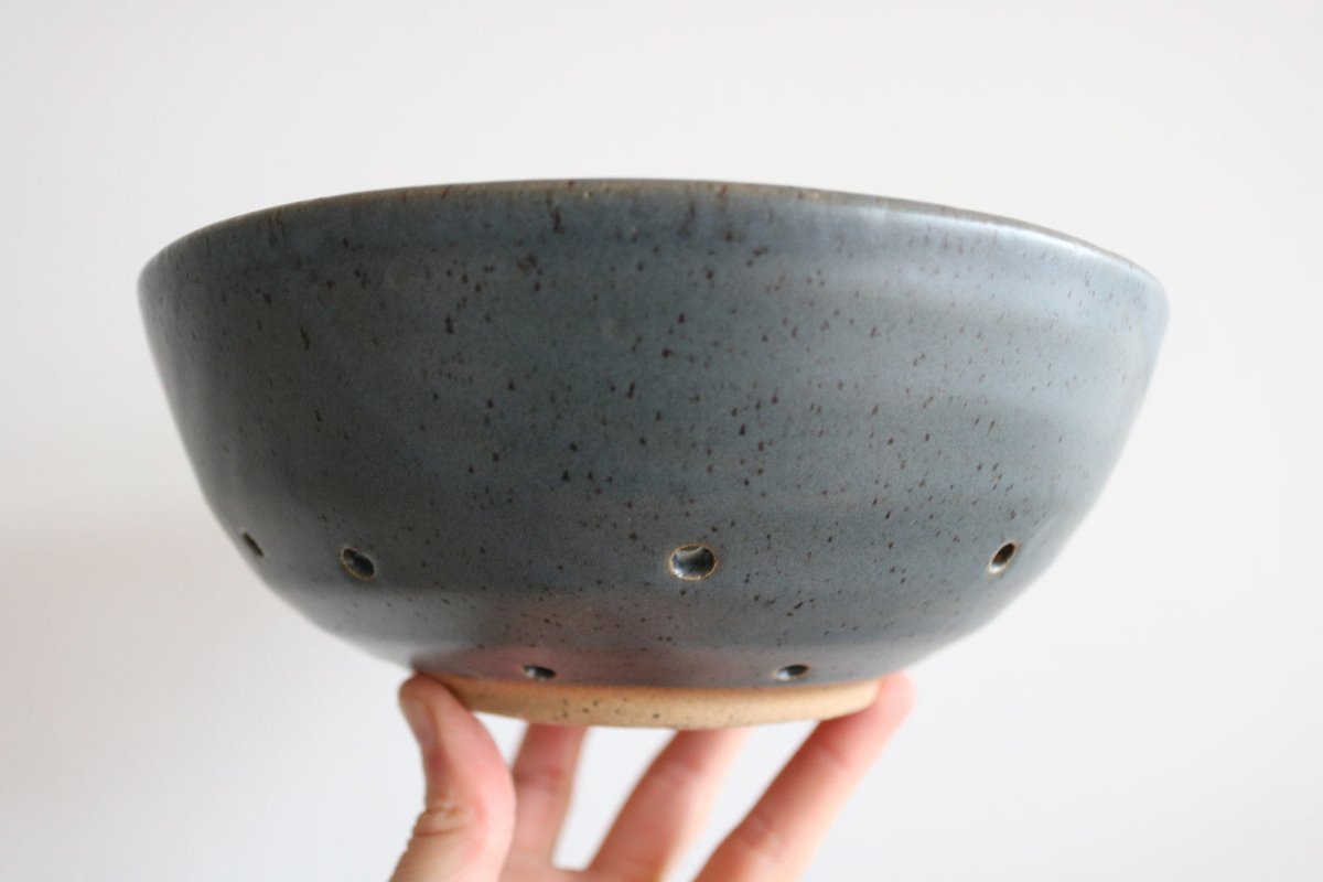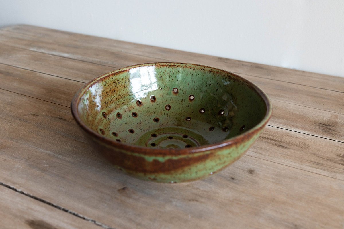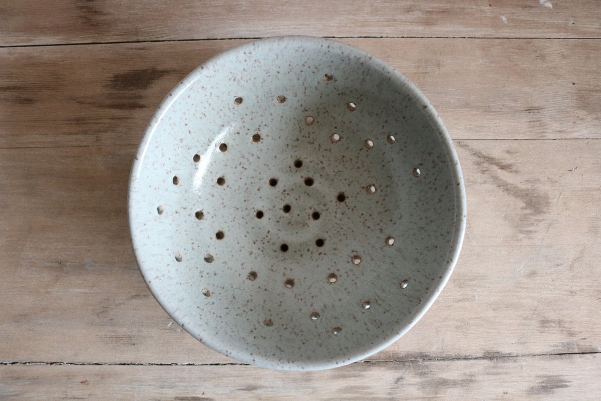 Wash, strain, and serve fresh fruit with this artisan stoneware berry bowl. Hand-thrown and food safe, it features precision drainage holes that keep berries secure while rinsing. Ideal for strawberries, blueberries, grapes, tomatoes, and garden produce.