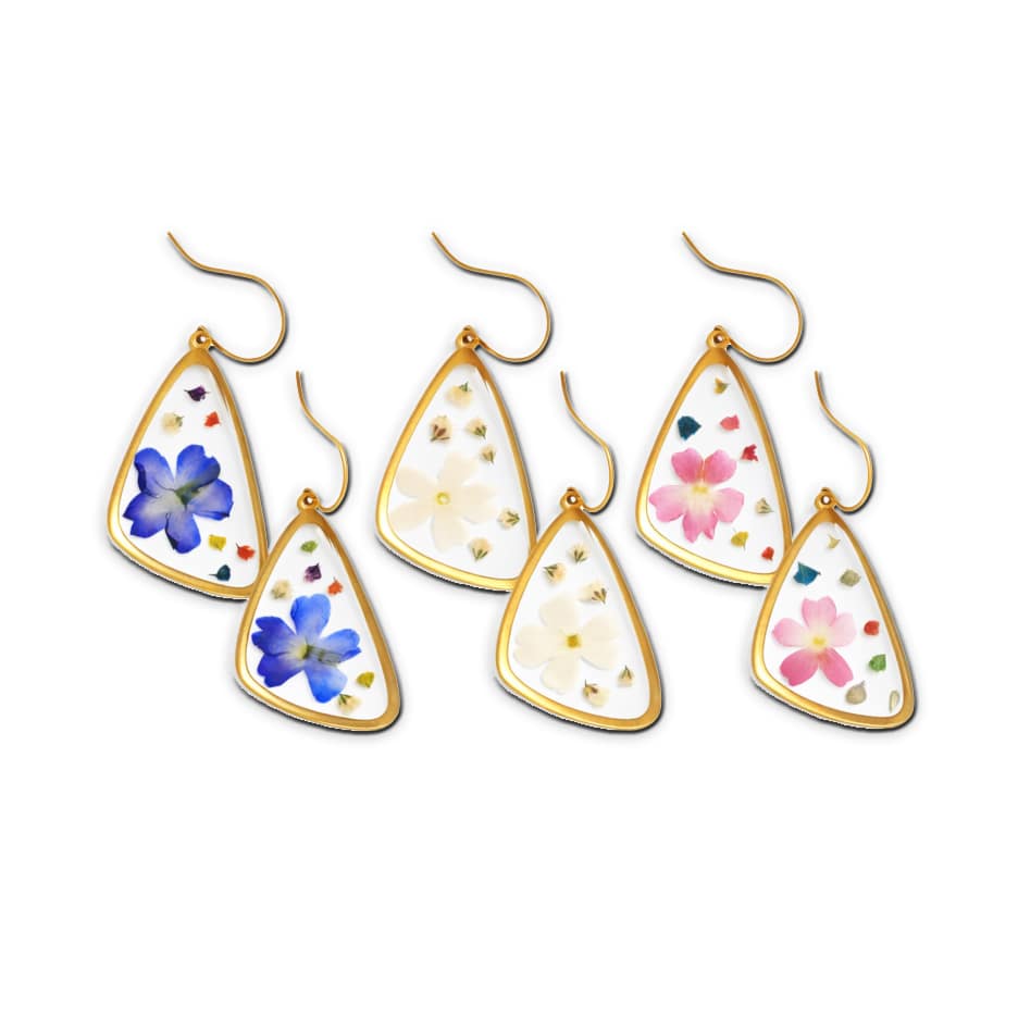 Made with Baby’s Breath and Verbena, these earrings carry special meaning—Baby’s Breath symbolizes purity of heart. Finished with nickel-free, gold-plated brass ear hooks, they are lightweight and comfortable to wear. Each pair ships in gift-worthy packaging and includes a printed symbolism tag with the botanical meaning.