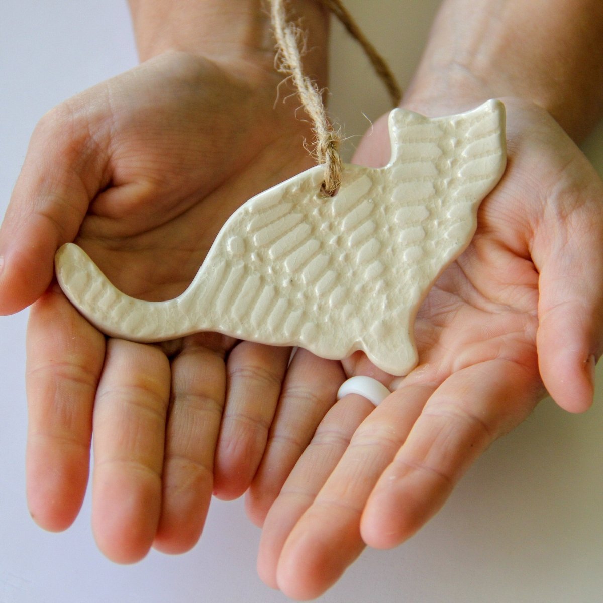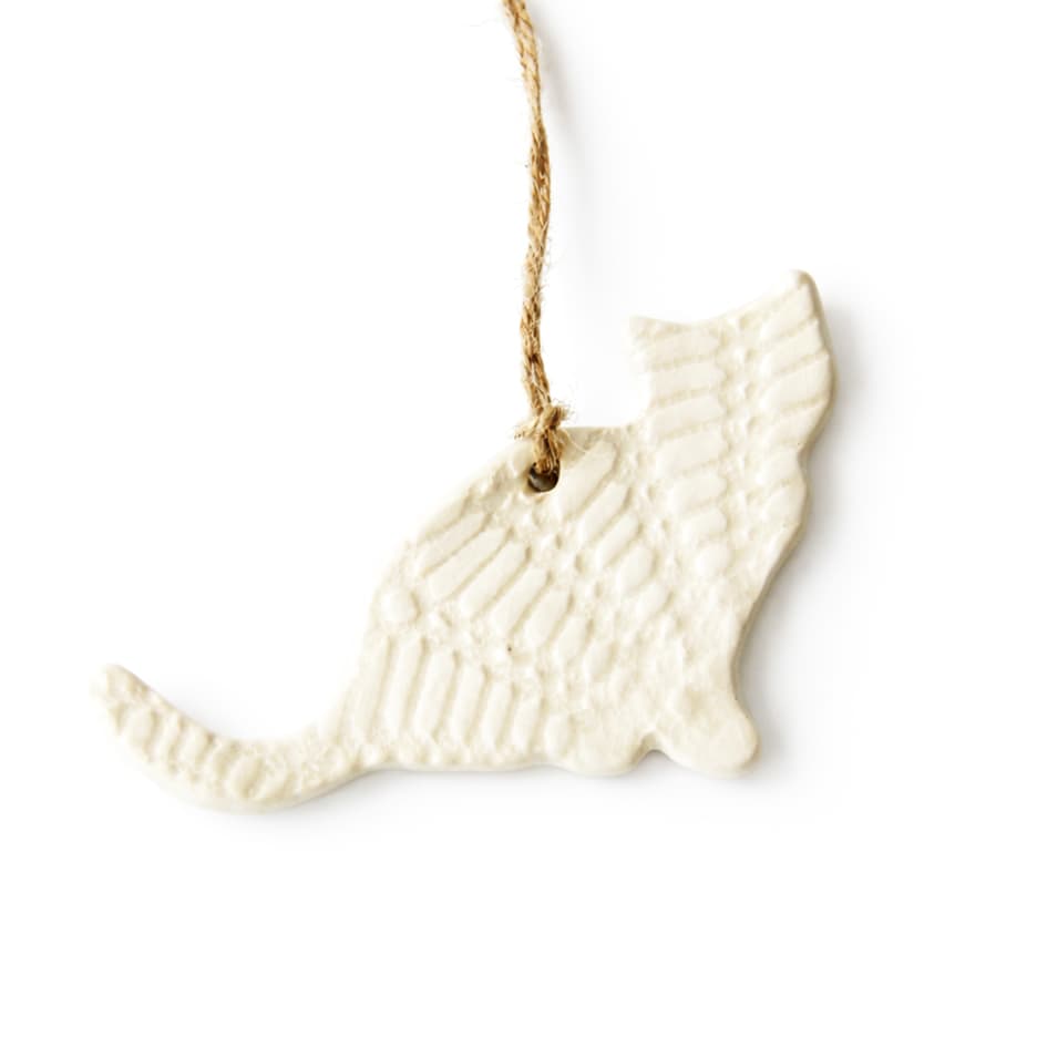 Celebrate the cat lover in your life with this handmade ceramic cat ornament. Pressed with a delicate lace imprint, each ornament has subtle variations that reflect its handmade character. Perfect for hanging on a Christmas tree, tying onto a gift, or giving as a thoughtful keepsake, this charming ornament adds warmth and personality to seasonal décor. Finished with twine for easy hanging.