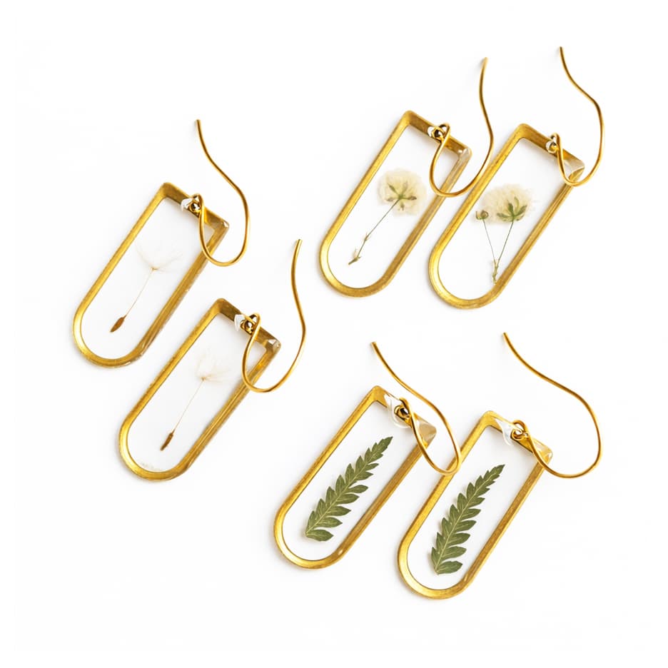 The Botanical Elegance Cathedral Earrings feature delicate cathedral window–shaped brass frames suspended from your choice of .999 sterling silver–plated ear hooks or 24K gold-plated ear hooks. Each pair showcases your choice of real preserved botanicals, creating a timeless, nature-inspired look.