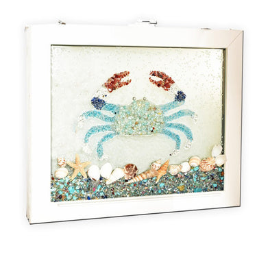 Capture the essence of coastal beauty with our Chesapeake Blue Crab Window Art, an elegant tribute to the shore handcrafted in the Outer Banks of North Carolina. This exquisite piece features a captivating blue crab design made from real seashells, colored stones, and glass, artfully arranged to bring the tranquility of the beach into your home. Each piece is truly unique and can be framed in your choice of an upcycled Pella window frame or a rustic reclaimed whitewashed wood frame, adding a touch of coastal charm to any space.