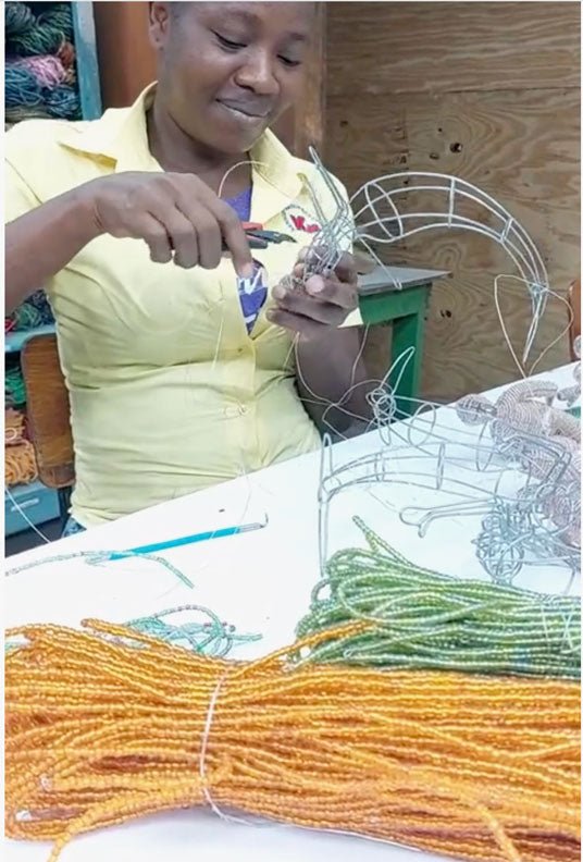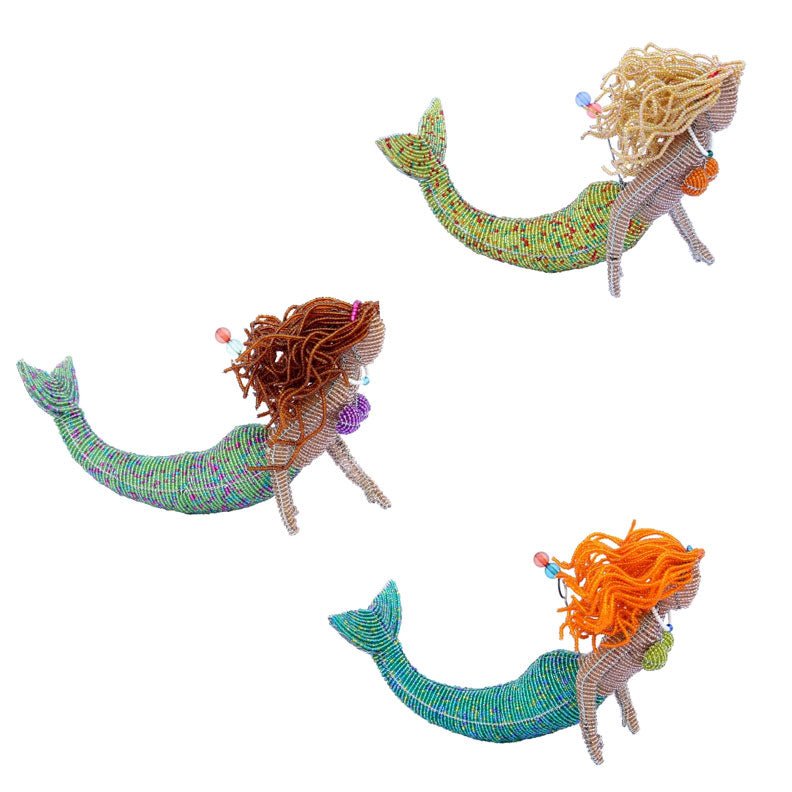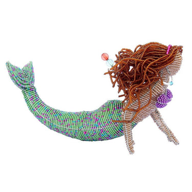 Discover the alluring beauty of the Mermaid Brunette hanging sculpture, with dimensions of 10 x 2.25 x 6.25 inches. Hand-crafted with precision and passion, each piece undergoes a meticulous process, from gathering glass beads to sorting colors. The Haitian artisans, who have over 30 years of expertise, use vibrant beads and wire to create a one-of-a-kind masterpiece that adds a touch of whimsy to your decor. Beadworx is more than just a work of art; it's a commitment to empowering individuals and communities. By choosing these handcrafted creations, you are supporting a cause that is dedicated to creating a brighter future for Haitian artisans. Since 2015, Beadworx has provided job opportunities and driven education initiatives. Join us in promoting sustainability and making a meaningful impact with your purchase. Experience the enchanting world of Beadworx – where each creation is a testament to artistry and dedication.