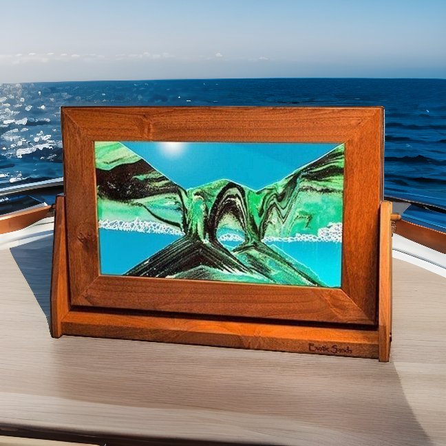 Discover the captivating beauty of the 9" x 12" Large Summer Turquoise Moving Sand Picture by Exotic Sands. Enclosed in a double-strength glass and alder wood frame, the gentle, rotating movement of this work of art provides a dynamic and mesmerizing experience. A captivating blend of black sand, four shades of white sand, and fine sea foam green glitter combine to create a 3-D effect with both transparent and opaque sands for a truly unique view. Enjoy the different perspectives of the double-sided design, featuring a half-rounded profile on one side and a flat surface on the other, for a beautiful addition to any space. Immerse yourself in the soothing serenity of this enchanting moving sand picture.