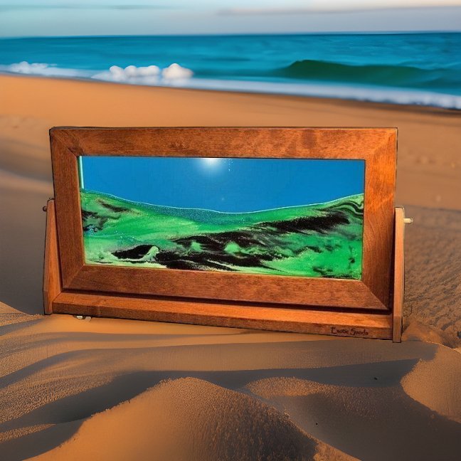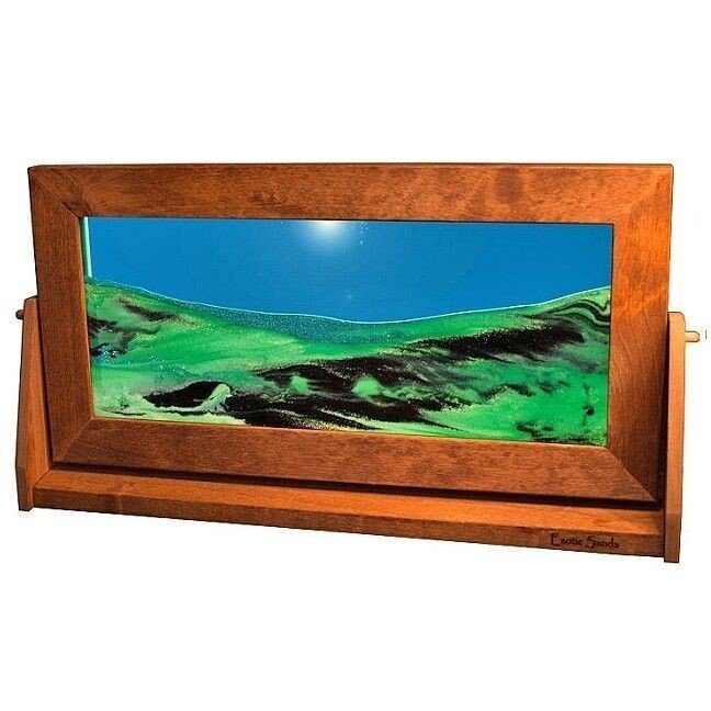 Witness captivating changes with the X-Large Summer Turquoise Moving Sand Picture, indicative of the finest craftsmanship and proudly MADE IN THE USA. Measuring 9" x 16", this beautiful piece consists of two layers of glass, within which are four distinct white sands, green sands sourced from South America, and delicate black and green glitters. Framing the glass is natural knotty alder wood that adds to the artwork's splendor. Its double-sided rotating frame is carefully handcrafted, with a half-rounded profile that showcases one face of the artwork round and the other flat. As you rotate this exquisite object, charming air bubbles suspend the sands, evolving into a fresh, one-of-a-kind scene. The differing weights of the elements guarantee they stay separated, creating a dynamic display. Plus, the mix of transparent and opaque sands adds a 3-D effect. This X-Large Summer Turquoise Moving Sand Picture grants you moments of solace and wonder