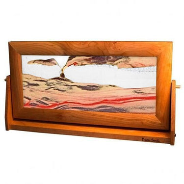 The X-Large Red Volcanic Clear Moving Sand Picture is an ever-evolving art piece that's guaranteed to offer an extraordinary visual experience with each rotation. Featuring a unique double-sided rotating frame with a half-rounded profile, this breathtaking creation boasts crystal clear liquid, accentuated by black and white sands, infused with red glitter, encased in double-strength glass, and framed in cherry wood. Bubbles cleverly lift the sands, creating picturesque scenes quickly or slowly as the casing turns, as the contrast between the black and white sands ensures they remain separate while varying levels of transparency and opacity give off a mesmerizing three-dimensional look. Make 9" x 16" of your space special with this grand-scale artwork that offers moments of relaxation, reflection, and enchantment.